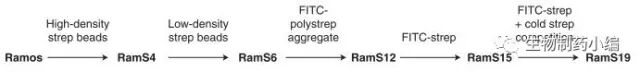 Ramos是來源于人Burkitt淋巴瘤的一株細(xì)胞系,在培養(yǎng)過程中其重排后的免疫球蛋白V區(qū)基因持續(xù)發(fā)生組成型突變,并表達(dá)到膜表面。早在2002年Sarah等人就報道了利用Ramos細(xì)胞系篩選出對鏈霉親和素有高親和力的IgM。他們將鏈霉親和素結(jié)合到磁珠上,從一群Ramos細(xì)胞中篩出對鏈霉親和素有低親和力的細(xì)胞群,之后降低磁珠上的鏈霉親和素的密度以提高篩選的苛刻程度,進(jìn)一步篩出親和力更高的突變。之后又進(jìn)一步用標(biāo)記FITC熒光的鏈霉親和素結(jié)合流式分選將抗體親和力進(jìn)一步提高。