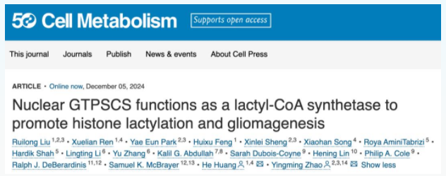 2024年12月5日,芝加哥大學(xué)趙英明教授、中國(guó)科學(xué)院上海藥物研究所黃河研究員團(tuán)隊(duì)在 Cell Metabolism 期刊發(fā)表了題為:Nuclear GTPSCS functions as a lactyl-CoA synthetase to promote histone lactylation and gliomagenesis 的研究論文。